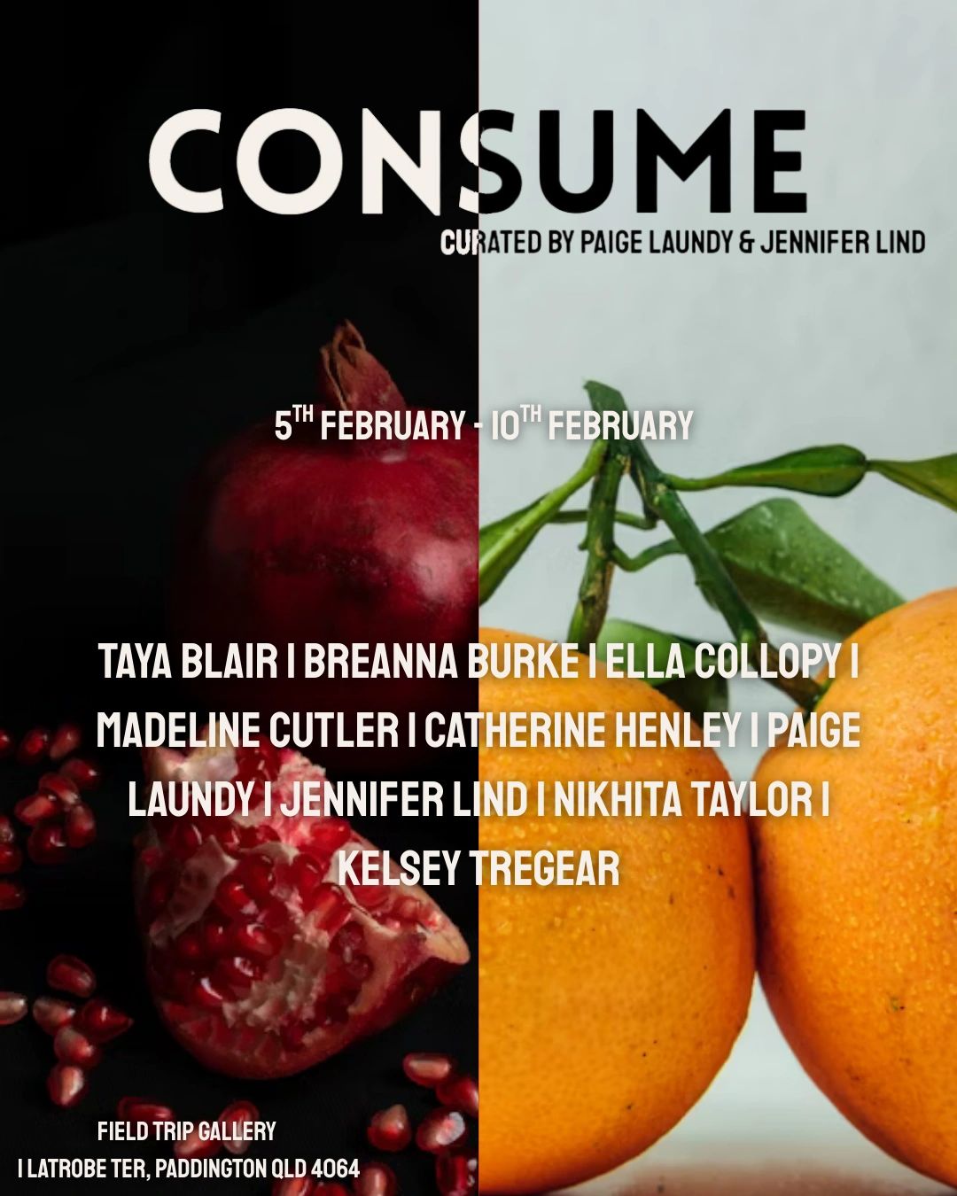 Group exhibition featuring Taya Blair, Breanna Burke, Ella Collopy, Madeline Cutler, Catherine Henley, Paige Laundy, Jennifer Lind, Nikhita Taylor and Kelsey Tregear